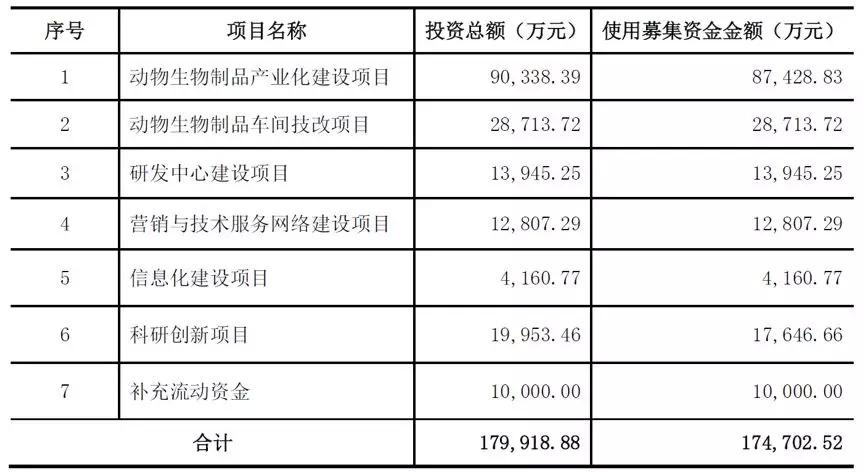 本次上市,公司计划发行不超过1.2亿股,募集资金将主要用于动物生物制品产业化建设项目、车间技改项目、研发中心建设以及营销与技术服务网络建设项目等。