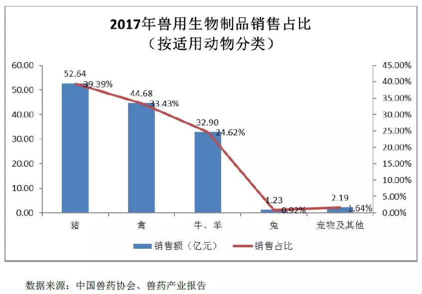 在这133.64亿销售中,猪用生物制品达到了52.64亿,占比39.39%。其次为禽类和牛、羊类,分别销售44.68亿、32.90亿,占比33.43%和24.62%。