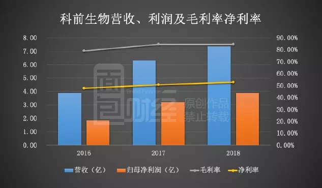 回到科前生物,从近三年的业绩表现来看,公司营收从2016年3.9亿上升到了2018年的7.35亿,同期的归母净利润则从1.86亿上升到了3.89亿,复合增速分别为37.28%和44.62%。