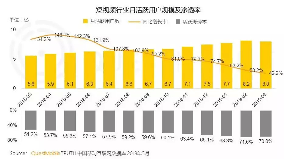 短视频填补了用户碎片化时间,更短、更强送、更碎片化的内容备受青睐, 2018年12月短视频月活跃用户规模达6.48亿,截至到2019年第一季度QuestMobile发布数据显示,短视频行业月活跃。用户规模突破8亿,不过人群仍然主要集中在抖音、西瓜、快手等头部短视频APP平台。