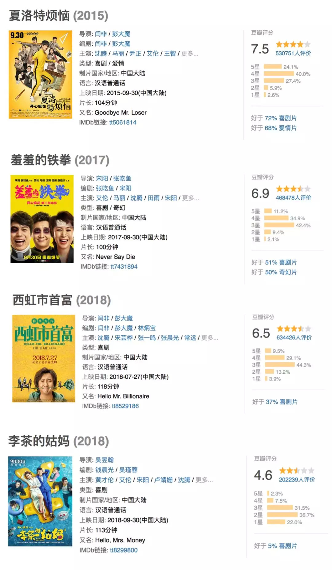 可以看到,从《夏洛特烦恼》开始,开心麻花的喜剧片豆瓣评分就一路下滑,虽然2016年上映的《驴得水》评分达8.3,但它不是严格意义上的喜剧。许多影迷怀疑开心麻花是否具备持续产出优质喜剧内容以及解决作品同质化的能力。