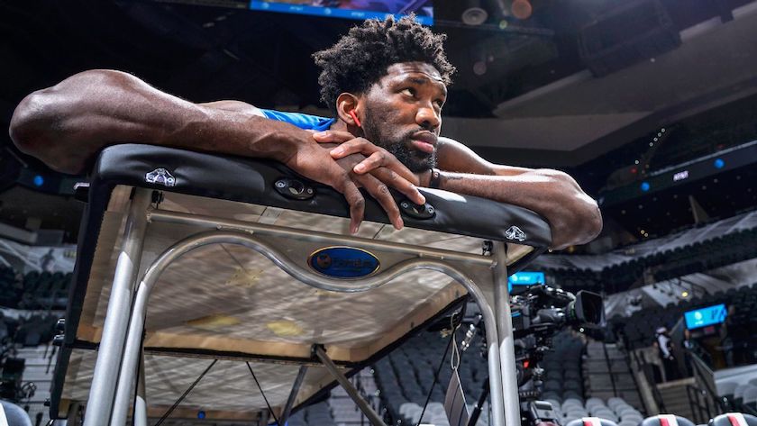不过,原本应该在封闭空间进行的体能训练突然被搬到了数万人注视的球场上,球员们的隐私保护可能就成了一个问题。“自由灵魂”恩比德不只一次被观众和媒体捕捉到在按摩台上看动漫、吃小吃的画面;训练师们还得保护球员在四面八方的镜头下不“走光”。