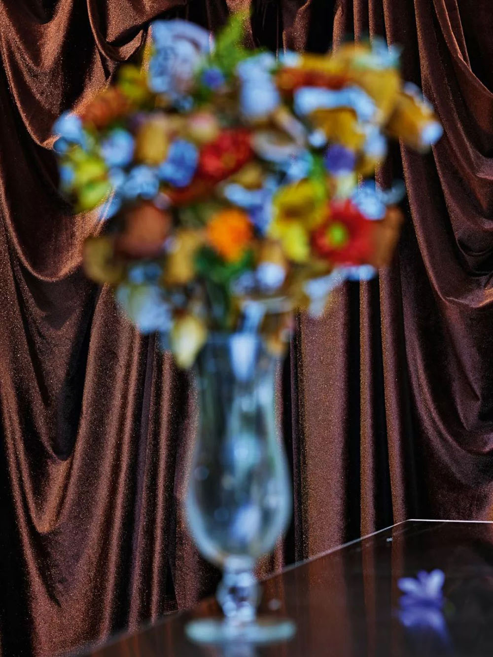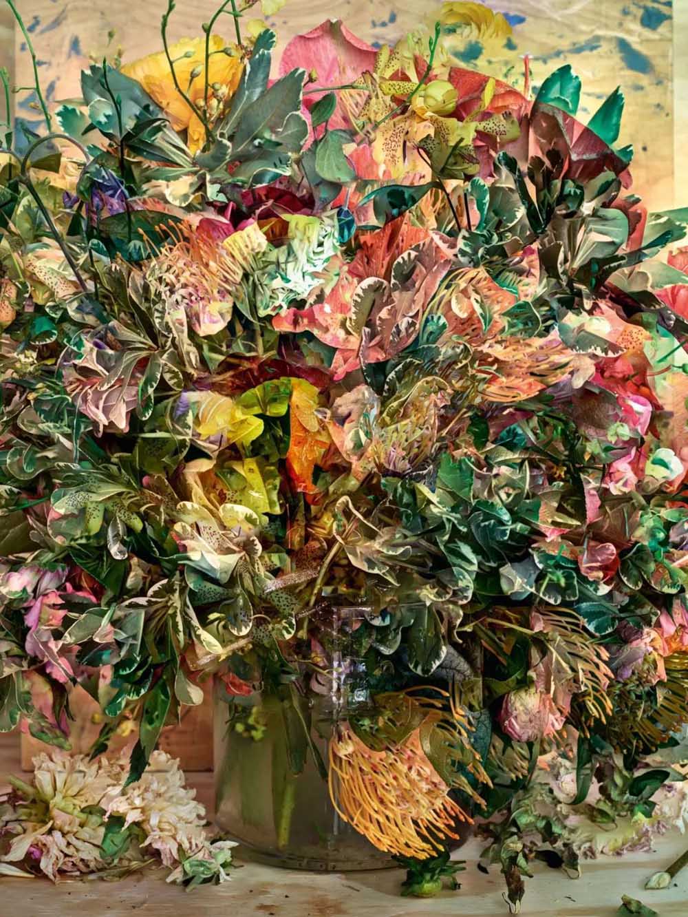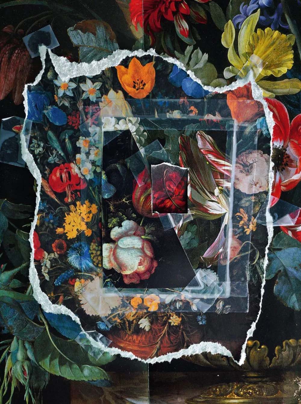 十七世纪的荷兰花卉画作,对我这一系列中的许多照片产生了重大影响。在尽管在他们的一些作品中,花瓶中的花朵不可能堆积很厚很高。但是受其启发,在这幅画面中,我通过将不同深度和高度的几层花朵叠放在一起,使花束变得非常高大而密集。同时保持焦点始终的清晰度,呈现了一个巨大花束的幻觉。