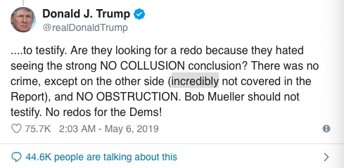 此外,特朗普本人还在6日发推特反对穆勒出席众议院听证会。他表示,民主党人想要重启“通俄门”调查只是因为穆勒调查报告的结果不是他们想要的。穆勒团队在“通俄”调查报告中指出不存在特朗普与俄罗斯勾结的行为,巴尔在阅读报告后也认定没有足够证据指明特朗普妨碍司法公正。