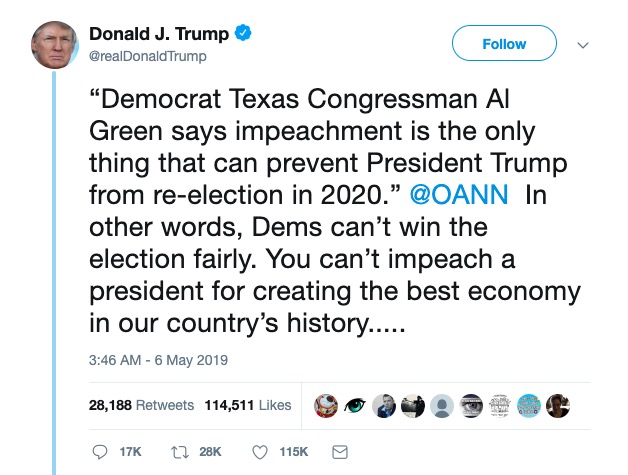 而特朗普则在推特上转发了民主党议员格林(Al Green)的话:弹劾特朗普是阻止他在2020年连任总统的唯一方法。特朗普提出,这意味着民主党人无法通过公平的渠道赢得选举胜利。“你无法弹劾一个创造了我们国家历史上最好的经济的总统。”