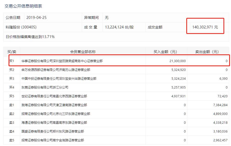 将科隆股份拉上涨停板次日起,华泰荣超即开始持续卖出。数据显示,在4月26日至4月30日的三个交易日内,华泰荣超累计卖出金额达2529.83万元,而买入额不足450万元。