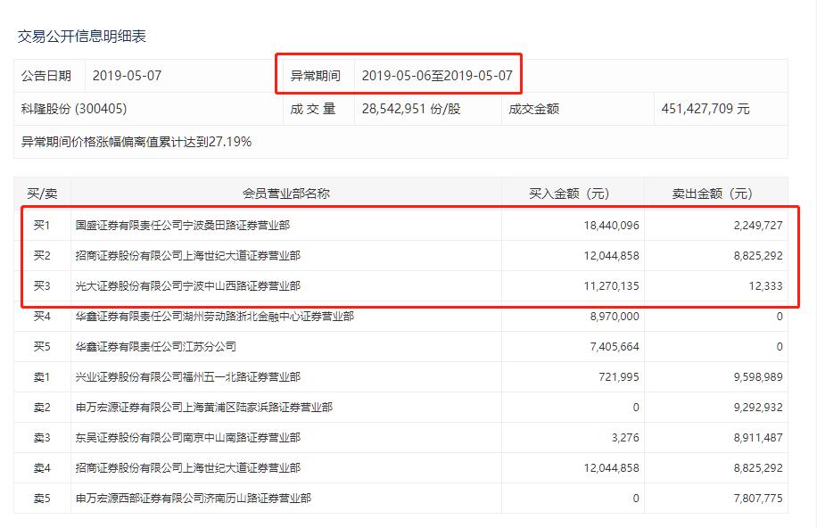 5月7日盘后龙虎榜显示,“五一”后的两个交易日内,宁波桑田路“回归”,以1844.01万元的买入额位居买席第一。而位居第二、第三的招商证券上海世纪大道证券营业部和光大证券宁波中山西路证券营业部,买入额也均超千万。