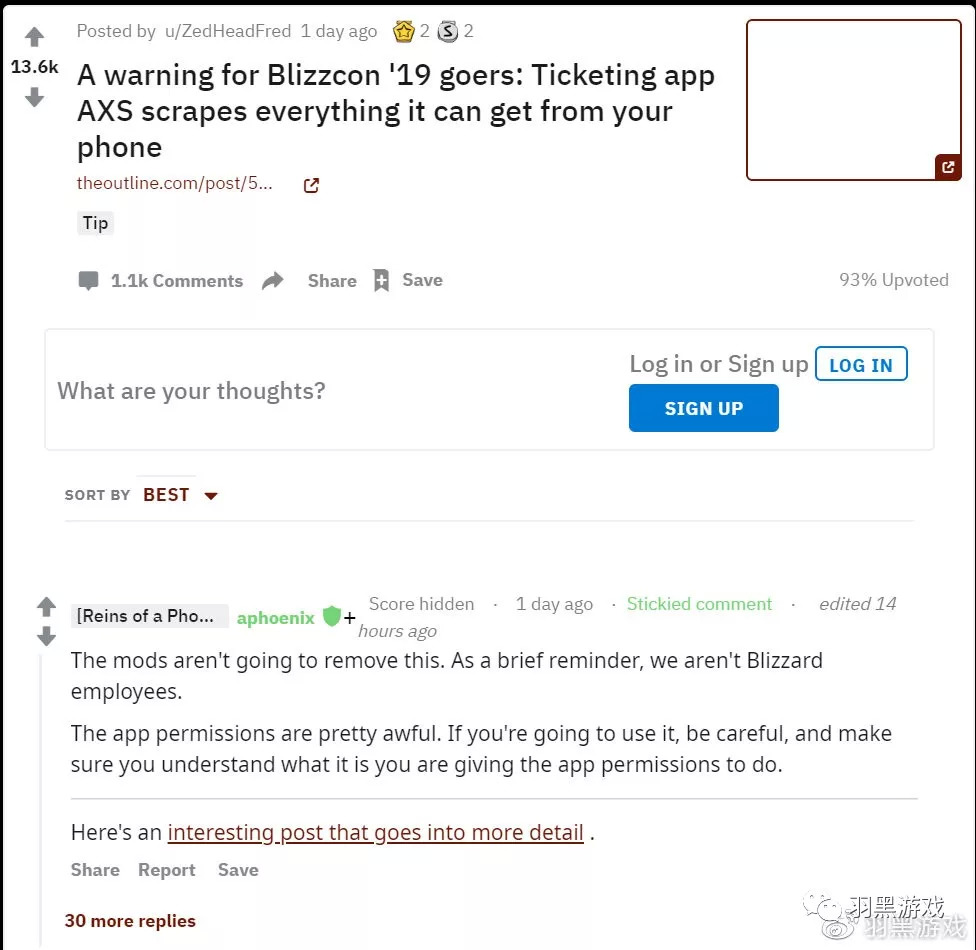 这句话彻底激怒了广大玩家,而手机也成为了人们表达对暴雪不满的经典台词。直到今年新公告的放出,暴雪强迫式的做法让玩家抗议的声音再次开始聚集。甚至还有玩家在论坛reddit指出,用于买票的AXS软件会窃取使用者手机中的私人信息。目前这个帖子已经有一千多条评论,一万多个赞。