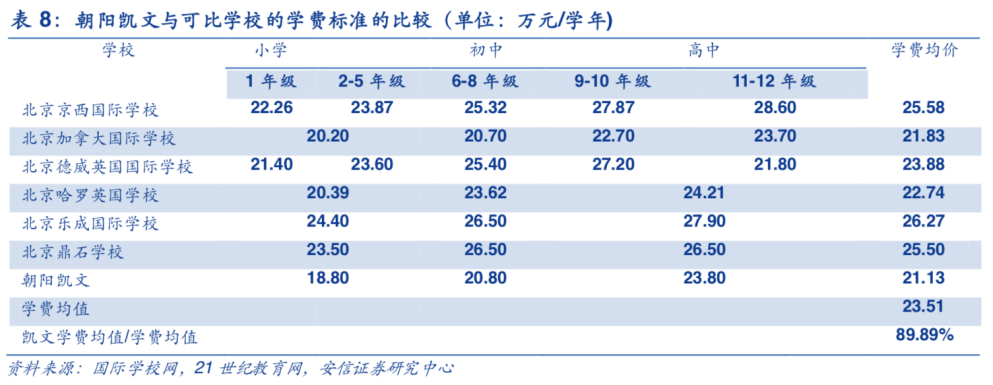 另外,朝阳凯文学校目前学费标准为小学18.8万元/学年、初中20.8万元/学年、高中23.8万元/学年。将此数据与北京其他国际学校横向对比来看,凯文学校的学费价格仍有较大的增长空间,且在同类学校中,拥有较大的竞争优势。