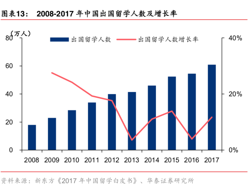 近十年来,我国留学生数量持续高速增长,2008-2017年复合增长率11.72%,2017年留学生人数已达60.84万人。