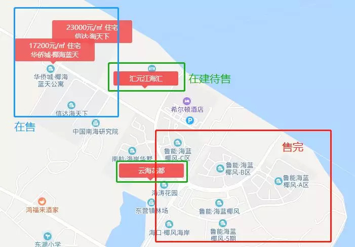 多家房企早已在东海岸圈地布局,主要集中在东北部海岸线,从北往南依次是华侨城椰海蓝天公寓、信达海天下、南航海岸华墅、海涛花园、鲁能海蓝椰风、汇元江海汇、云海花都7个楼盘,汇元江海汇、云海花在建待售。