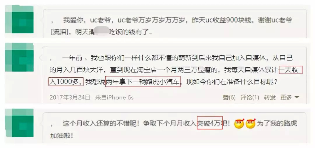 一篇文章阅读量过百万,广告分成+补贴,收益多的上万元。据新榜报道,30人的做号集团,一个月平台分成700多万。还有UC平台上有留言,一日收益达900元;两年拿下一辆路虎;期待下月收入破4万。