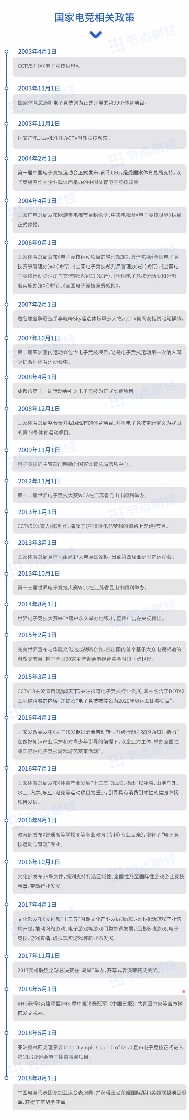 2003年4月,CCTV-5,体育频道,首次开播《电子竞技世界》。电子竞技正名之路迈出第一步。之后的15年,从电子竞技正式列入体育项目,到“电子竞技运动与管理”专业进入大学校园,再到中国电竞代表团征战亚运会。