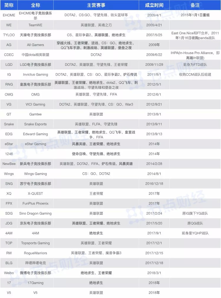 2016年之后出现的12家俱乐部,主营赛事包括英雄联盟、王者荣耀、绝地求生。曾经大型电竞俱乐部,如EHOME、WE等,经历一些电竞游戏的沧海桑田之后,不得不解散一些电竞分部。
