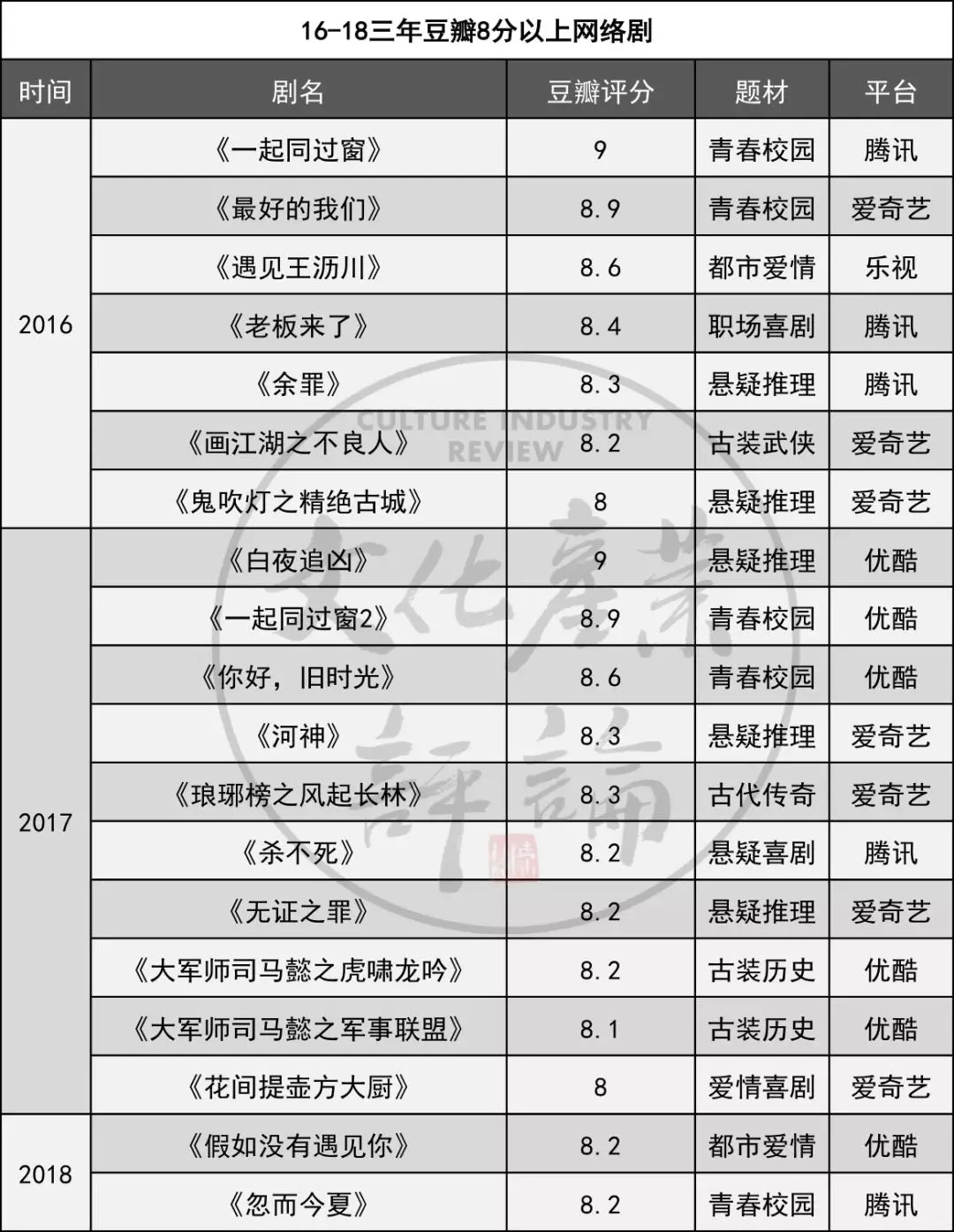 像《白夜追凶》甚至被美国著名视频网站Netflix买下了播映权,成功出海。《大军师司马懿之军师联盟》不少剧集得到了受众的广泛好评。豆瓣网上评分8分以上的精品网络自制剧进行统计,数量上明显超过前两年,事实证明网络剧也可以口碑与流量双丰收。