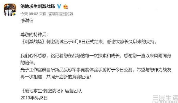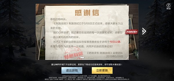 说实在的,听到这个消息小编我当时是一万个不信,你见过谁能下蛋的母鸡杀了吃肉吗?但结果事实无情的打脸,一觉起来《刺激战场》真的“凉了”,并且官方在微博上还发出了一封感谢信宣布,“《刺激战场》刺激测试已于5月8日正式结束”,打开游戏就提示更新,而在更新完成后就变身为光子旗下的“新游洗”《和平精英》。
