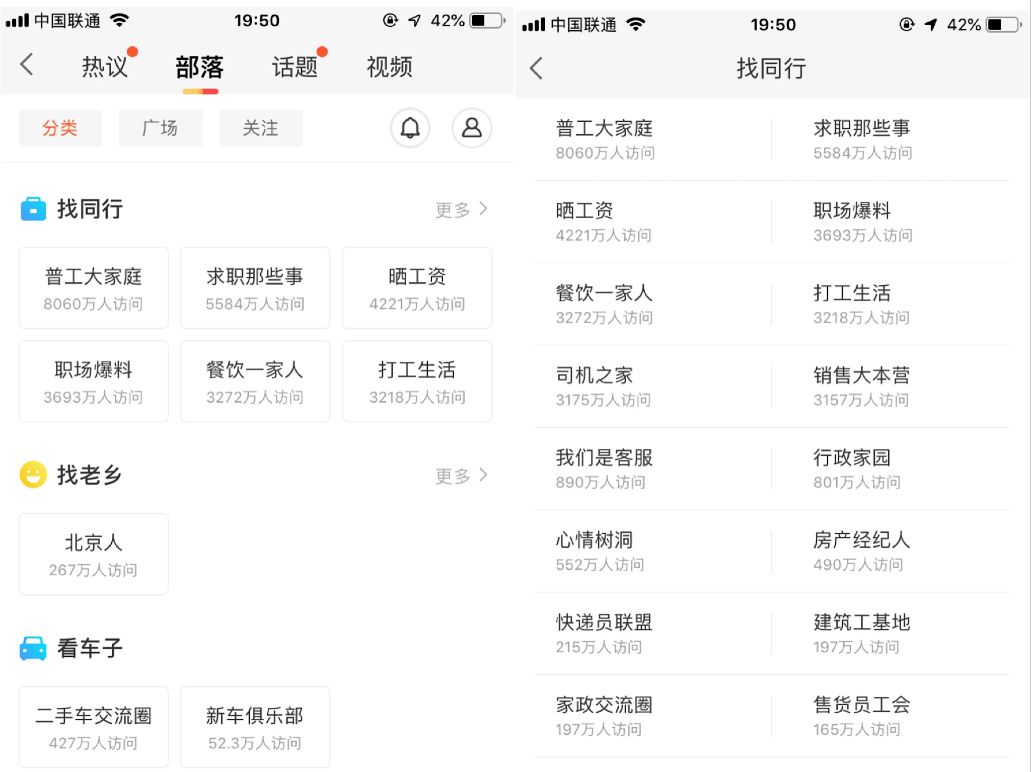 从App的设计可以发现,58部落里的职场模块针对的其实是目前市场上还比较空白的蓝领阶层。因为在找同行的模块里,排名前列的几乎都是普工、餐饮、房产经纪人、快递员、行政员、滴滴司机、外卖员、焊工、售货员工、保安等职业。