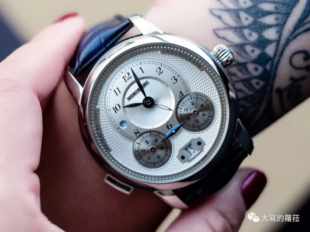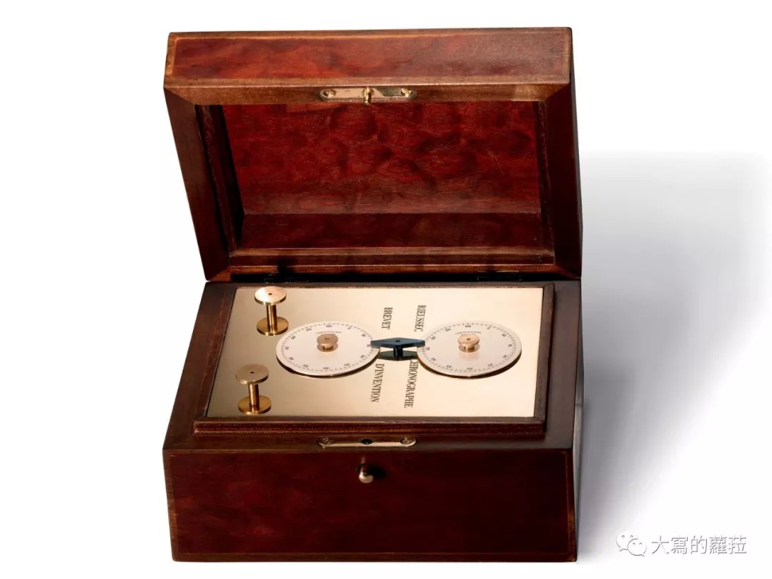 刚才说到万宝龙的码表特点,就要说到明星系列的计时码表,这也是要说到计时码表在19世纪时,是必须要用书写记录的方法操作。世界上第一个计时器是1821年由Nicolas Rieussec所设计盒形码表钟,他受法国波旁王朝所托,研发第一个测量时间流逝的装置,这个装置结构设计是一个座钟,在开始与结束测量时间时,会在面盘上滴下墨水,文献里显示Rieussec的发明是在1821年底或1822年完成的,此一设计是用以赛马计时之用。在Nicolas Rieussec的原创计时装置设计中,当计时功能启动时,计时器会在转动的表盘上滴下墨水,将流动的时间“写”出来。万宝龙根据这个〝书写时间〞的概念,2005年开始在旗下的力洛克表厂秘密进行创作计划,后来在2008年正式推出明星系列中的Nicolas Rieussec计时码表,其灵感来自于这个书写码表的概念,以两个醒目的计时碟盘设计让人惊艳,也因此建立了属于万宝龙自己的经典码表款式之一。