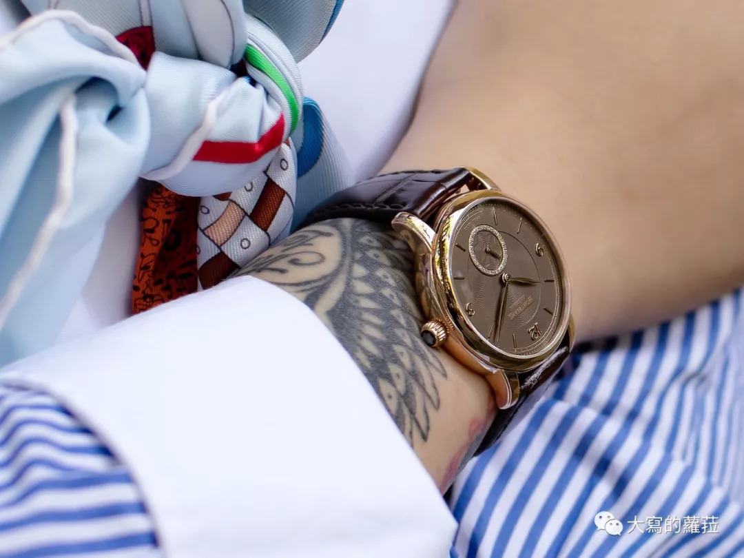 刚才说到选表的几个关键,最终的关键当然在于顺眼的颜值,明星系列的设计最经典之处可能就在其无侵略性的设计,就像每个人身边都需要一个靠谱的朋友那样的自然而然,妥当的书写体阿拉伯数字,不似其他品牌偏好的正经军表形式的阿拉伯数字正体,也不似强调古典风情的古典花体,而是略带粗体却有书写流畅形式的设计,搭配轨道式刻度、柳叶形蓝钢指针,都是大家最爱的腕表元素,加上面盘中央一个小同心圆使用了精致的纹路做出层次。笔直又略带曲线的表耳加上浑圆有劲道的表壳,是在每个设计元素都完整了热爱经典腕表人们的理想要求。