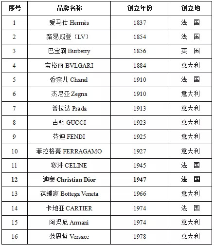 另外,根据全球著名审计和企业咨询公司德勤(Deloitte)公布的“2018年全球奢侈品力量排行榜(Global Powers ofLuxury Goods,2018)”,前5位分别是LVMH(隶属迪奥集团旗下)、雅诗兰黛集团、历峰集团、意大利眼镜巨头陆逊梯卡、法国开云集团。