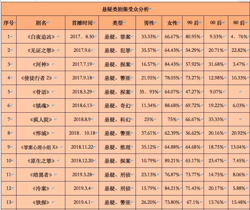 而这些类型的作品在内容创作中多以女性为目标受众,随着这类内容的不断产出,视频网站中以女性为受众群体的用户粘性进一步增强。基于这样的大环境,悬疑剧作为深受男性观众喜爱的剧集类型,具备了打入男性市场的潜力。