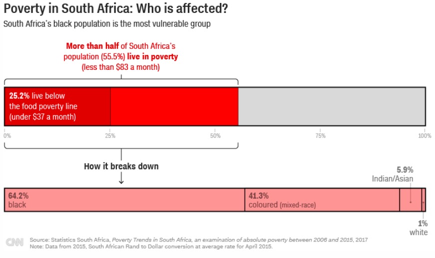 此外,尽管该国实现民主已有25年,世界银行还是将南非评为最不平等的国家,涉及收入、发展机会和必要的公共服务等。根据世界银行给出的数据,2011年到2015年,南非最富有的10%人掌握着全国71%的财富。而南非人口中有55.5%生活在贫困线以下(月可支配收入低于83美元,约合564元人民币),其中绝大部分是有色人种,64.2%是黑人,而白人仅占1%。根据《金融时报》报道,南非黑人家庭收入平均比白人家庭低20%。
