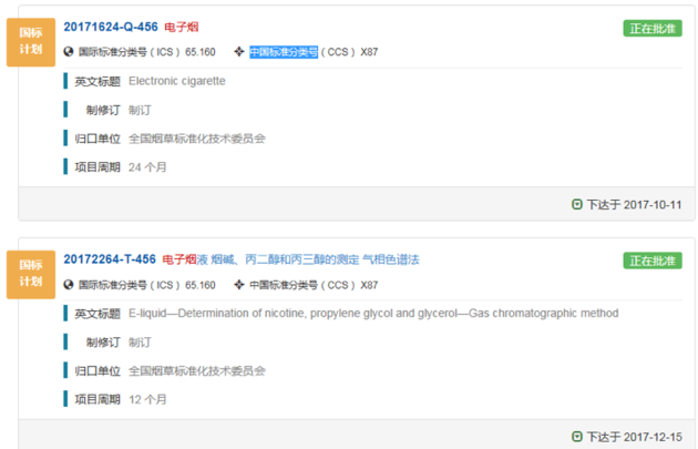 但需要注意的是,记者查询全国标准信息公共服务平台了解到,归口于全国烟草标准化技术委员会的两份国标计划《20171624-Q-456电子烟》、《20172264-T-456电子烟液烟碱、丙二醇和丙三醇的测定气相色谱法》,已于2017年10月11日和2017年12月15日分别下达,目前已处于批准阶段。而在上述两份国标计划中,电子烟、电子烟液在中国标准分类号中均属于X87代码范畴。这也意味着,一旦上述两份国标计划通过批准并发布,电子烟将明确被归为制烟类产品接受监管。