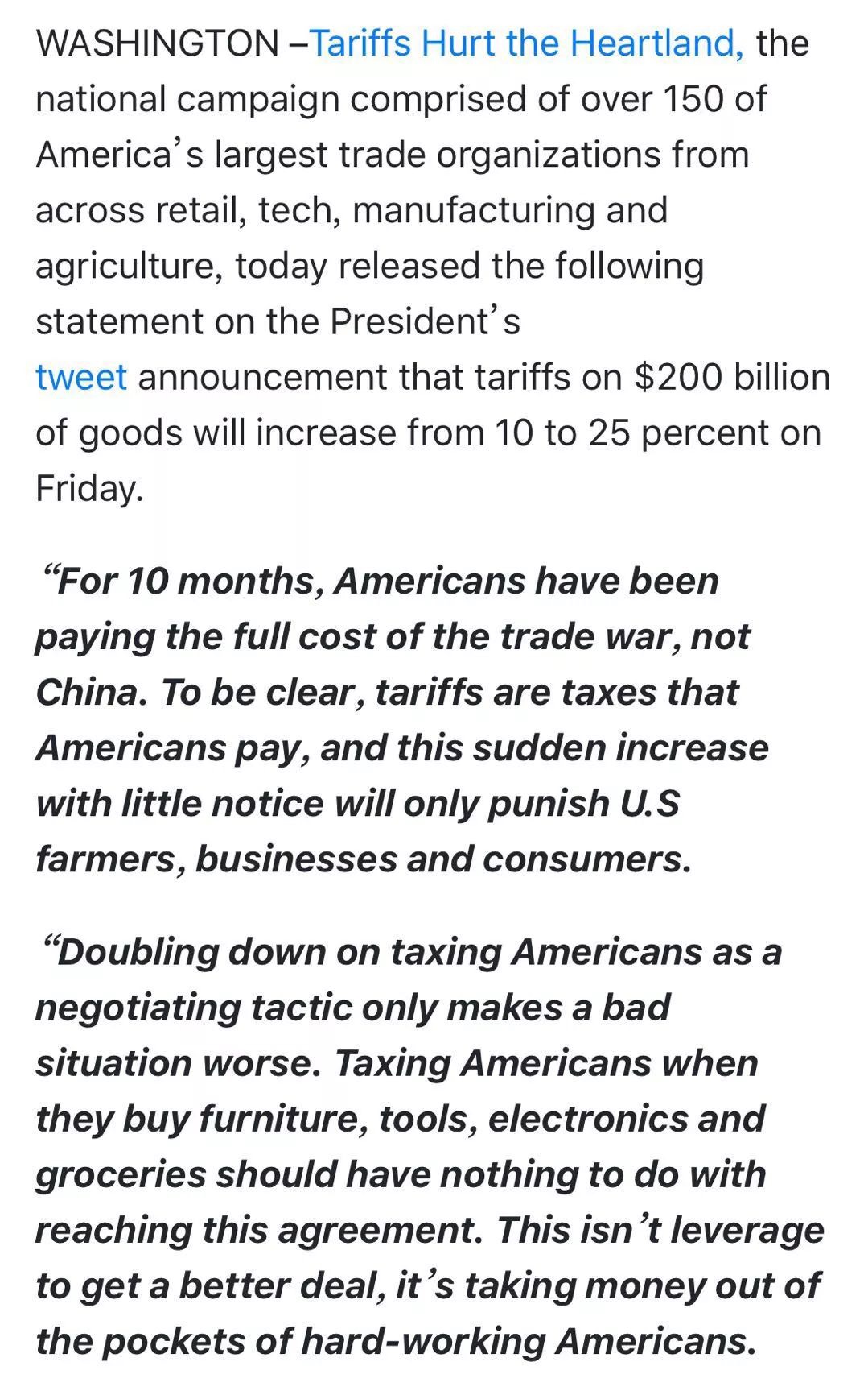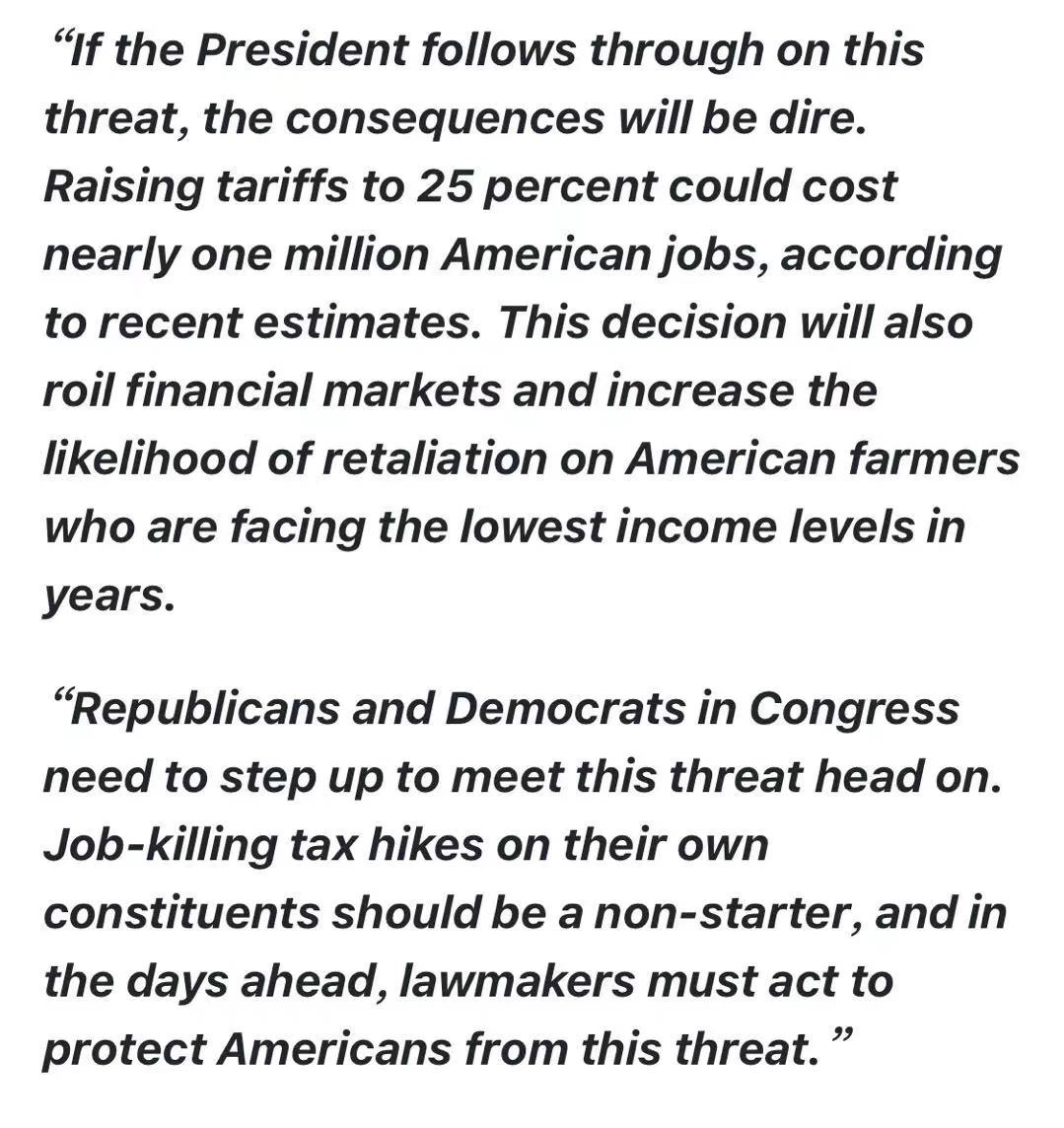 代表美国150多家贸易协会的游说组织“关税伤害美国腹地”(Tariffs Hurt the Heartland)当天即发表声明,强烈反对总统突然发起的关税威胁,指出关税是由美国人支付的,上调关税只会惩罚美国农民、企业和消费者,而将对美国人征税作为一项谈判策略只会让情况更加糟糕——关税上调至25%会减少近100万个美国就业岗位。这项决定还将加大金融市场动荡,并为美国农民当前已经不乐观的经济情况雪上加霜。