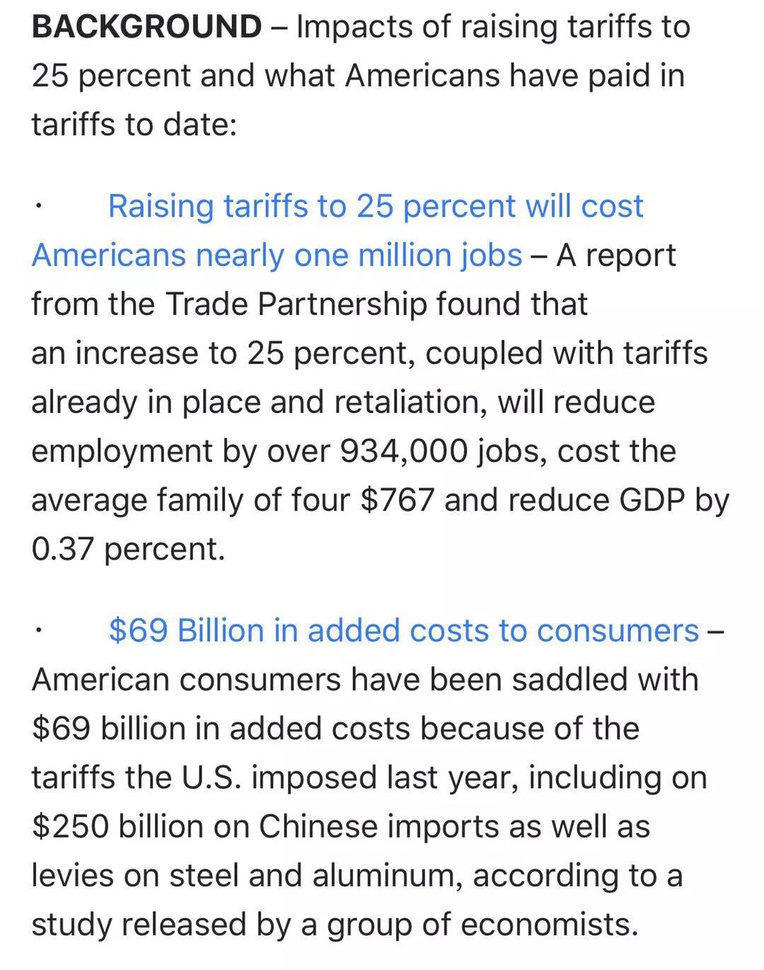 贸易合作伙伴(Trade Partnership)的一项报告表明,将关税上调至25%,再加上已经加征的关税及报复,将减少超过93.4万个美国就业岗位,让普通的美国四口之家多花费767美元,并让GDP放缓0.37%。