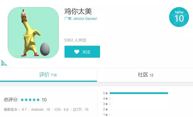 而横空出世的《鸡你太美》无论是游戏的名字,还是角色的外观(中分头,背带裤,篮球)以及动作等,都和“蔡徐坤打篮球”视频中蔡徐坤的形象如出一辙。从结果来看,游戏的这些设定明显相当对玩家们的胃口。所以在Taptap平台上,《鸡你太美》就成功收获了大量的5星好评让游戏获得了10分的满分评价!