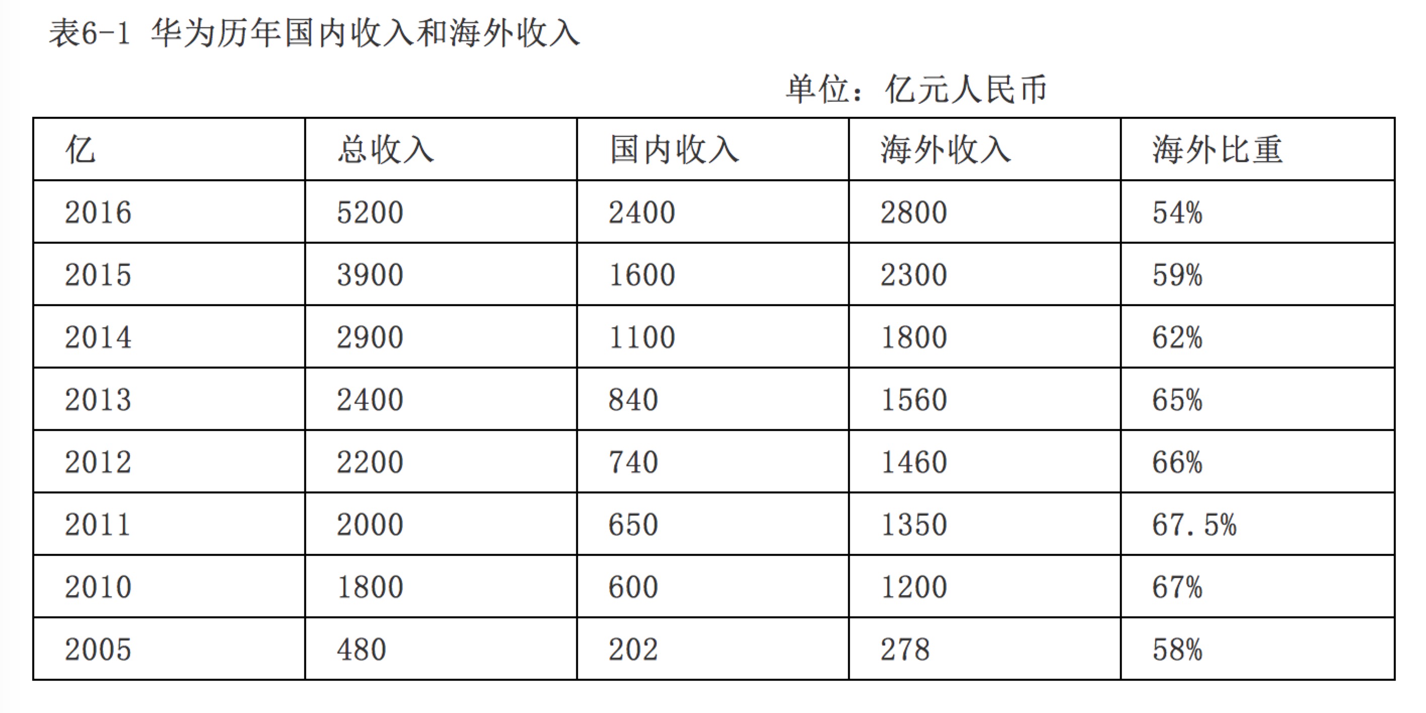 目前,华为业务遍及全球170多个国家和地区,服务全世界三分之一以上的人口。自2005年海外收入首次超过国内收入以来,海外收入的比重一直保持在54%~70%之间。