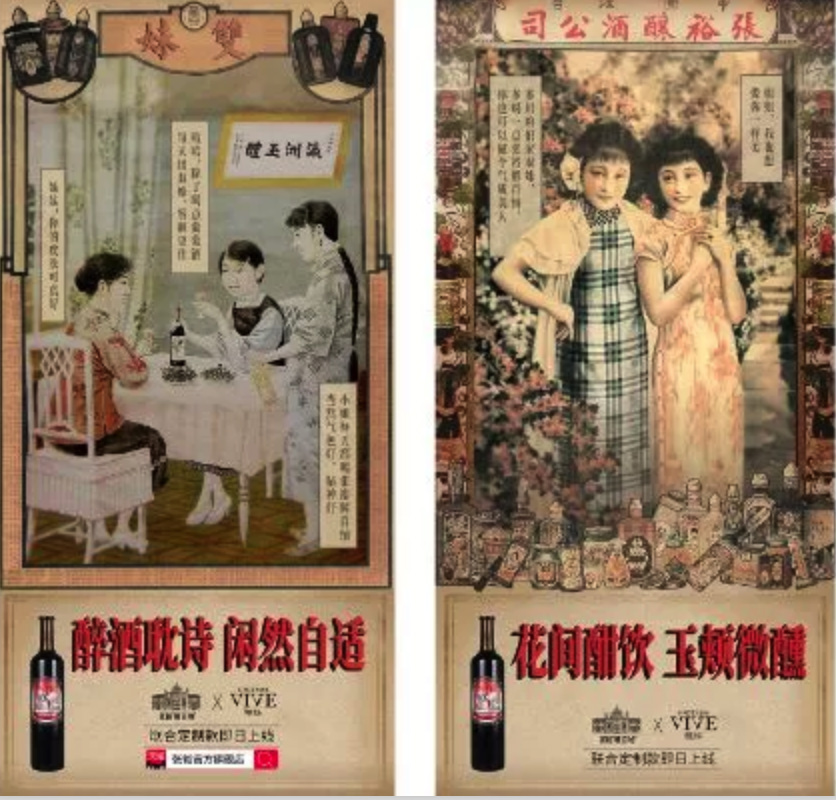 近日,中国最大葡萄酒生产商张裕携手上海家化旗下美妆品牌雙妹,推出了定制款的解百纳红酒。这款定制产品以复古为主题,酒标采用民国时月历牌的画风,宣传海报也分别以民国时期丁云先所画的张裕老广告和杭樨英所画的雙妹老广告为底版进行再创作,身穿旗袍的大户小姐手握定制款解百纳谈笑风生。