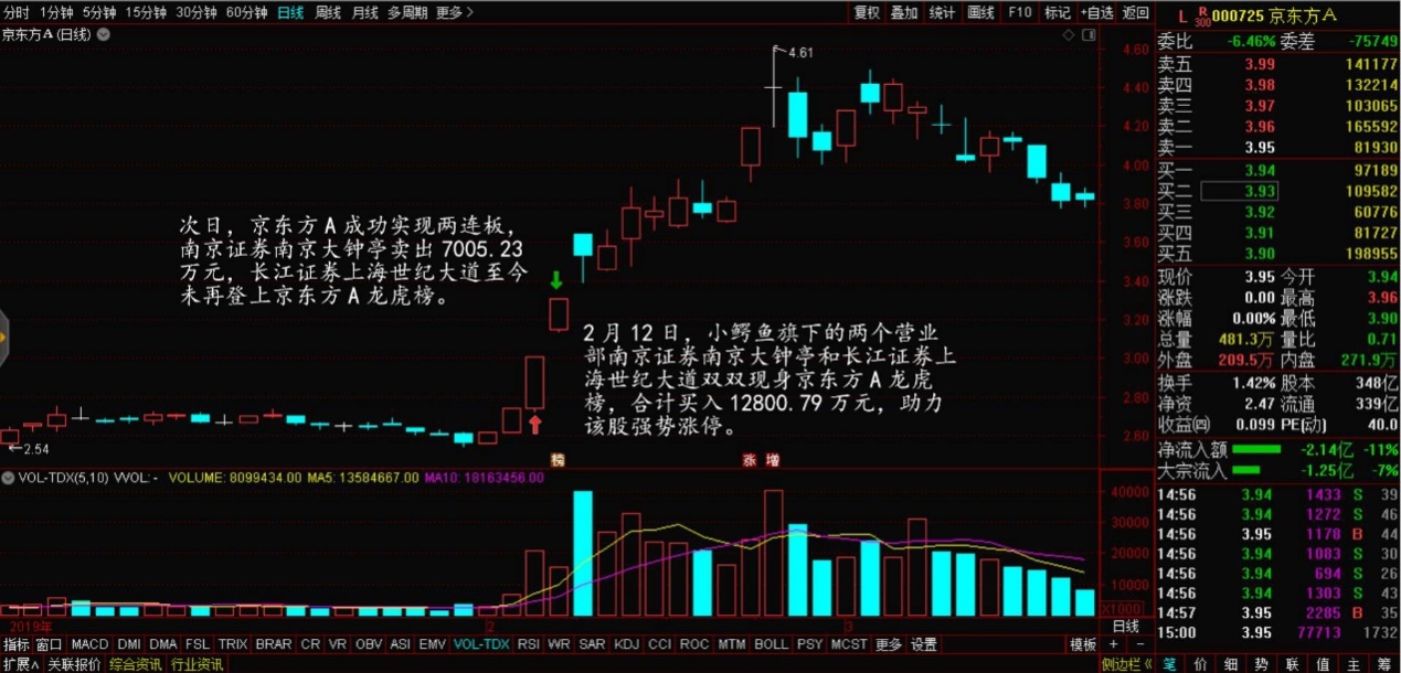 次日,京东方A成功实现两连板,南京证券南京大钟亭卖出7005.23万元,获利退出。长江证券上海世纪大道至今未再登上京东方A龙虎榜,不过参考该股后续的股价走势以及小鳄鱼的操盘风格,大概率也早已成功获利退出。