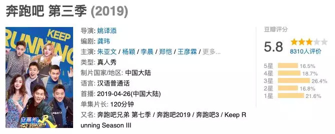 应该说,《奔跑吧》占据了地利和人和,但奈何不占天时。从目前播出状况来看,这一季《奔跑吧》首播收视率被湖南卫视的《向往的生活》重挫,在综艺上的热度也是被视频平台的创新节目《创造营2019》《我是唱作人》碾压,豆瓣评分仅有5.8分。