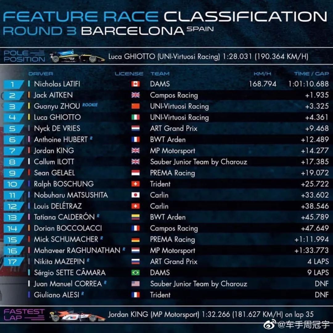 “ 最后四圈非常艰难,轮胎几乎消耗完,而杰克晚进站两圈,他最后也超过了我,”周冠宇继续说,“我没有防守太多,不然可能领奖台也会变得困难。整场比赛我们紧盯着尼古拉斯,可能没想到其他车手的威胁。 但是第三名也让我很开心,收获了中国车手F2第一个领奖台。”