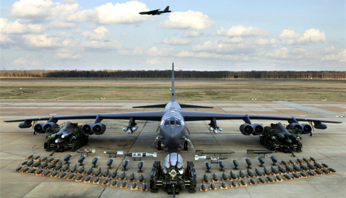 美国总计生产了约750架B-52轰炸机。尽管最新一架B-52走下生产线是在1962年,但美国空军仍打算让它们服役到2040年。B-52是一种多用途重型轰炸机,可以装载无人机、航天飞机部件、巡航导弹,甚至核弹。
