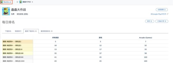 结果Beetles.io获得了全球用户的认可,进入13个国家/地区的Top 10,在5个国家的Google Play排行榜当中登陆总榜榜首。