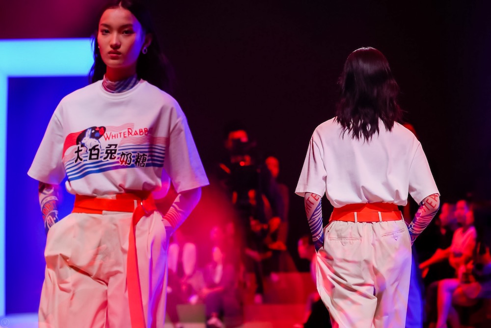 乐町(LEDIN)还和大IP“大白兔”联名,将本土消费者所熟悉的大白兔奶糖logo、“大白兔”品牌经典红白蓝三色运用到服饰设计上。让大秀观众陷入怀旧的同时,也感受到一份儿时的纯粹的快乐。
