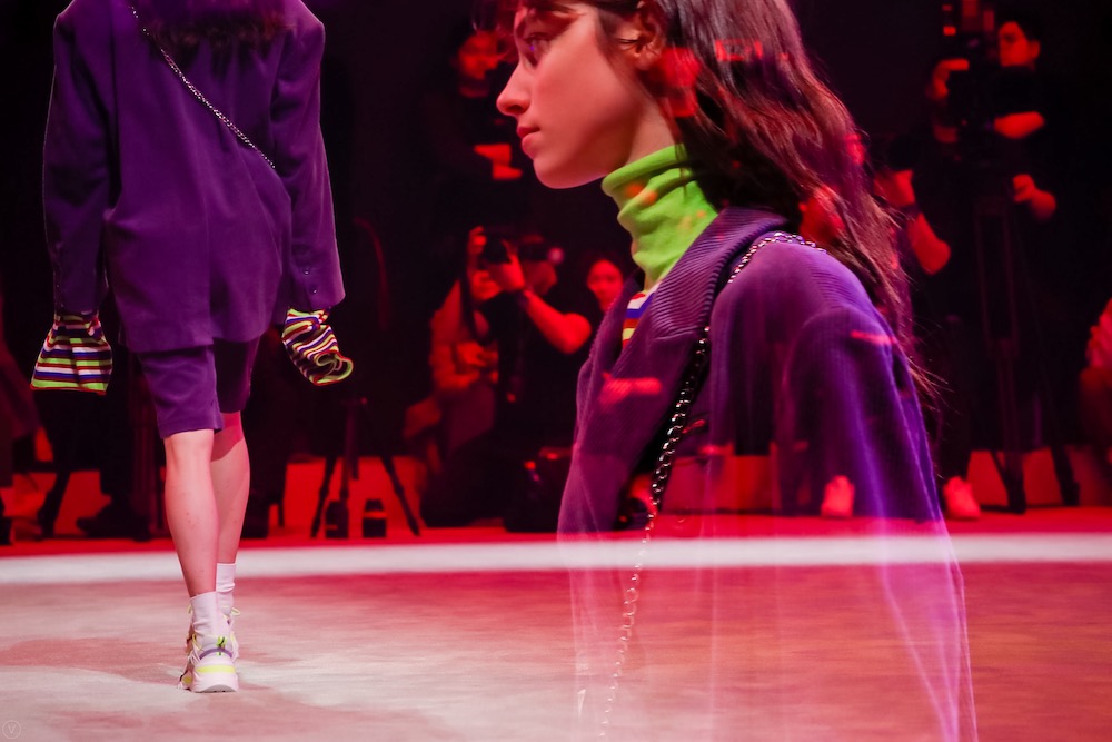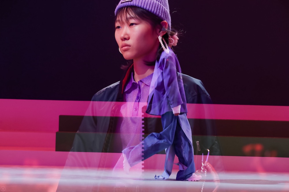 此次大秀秀场灵感来源于超现实魔幻题材电影《潘神的迷宫》。在电影中,迷宫守护者潘神对女主人公Ophelia说,当门锁上的时候,“那就用笔,自己打开一扇门。”由此,乐町将秀场装置成略微曲折的迷宫,结合以绿色、粉色、橙色为主的变幻着的色彩,呈现少女梦境一般的神秘感。