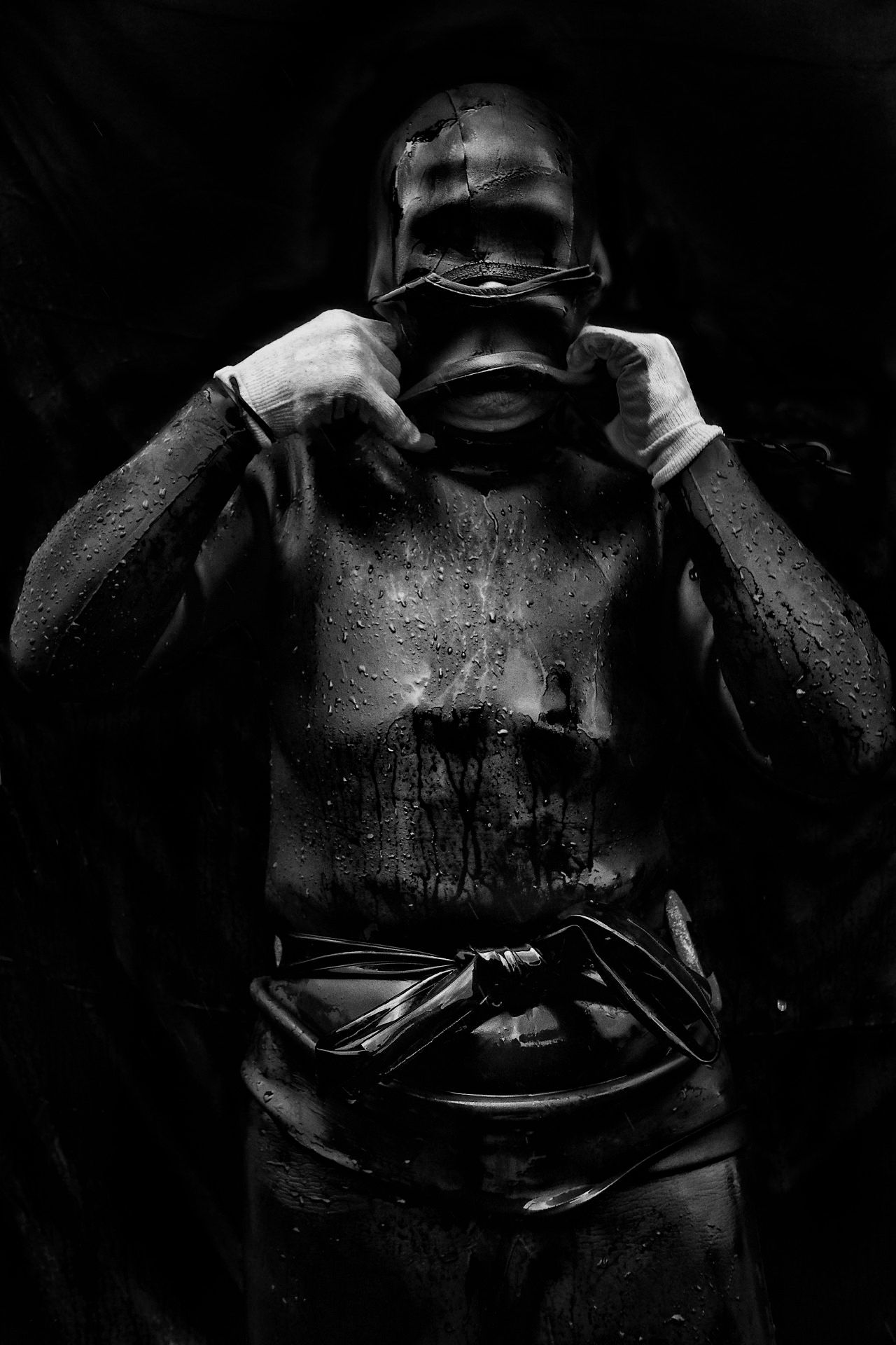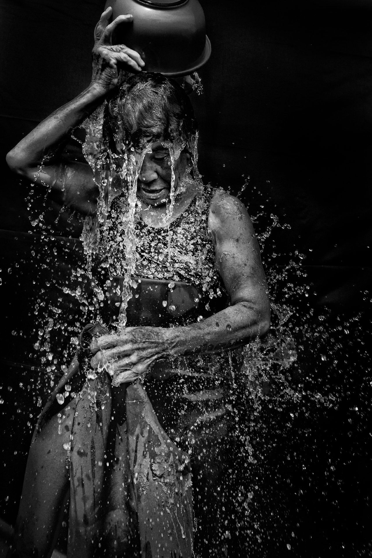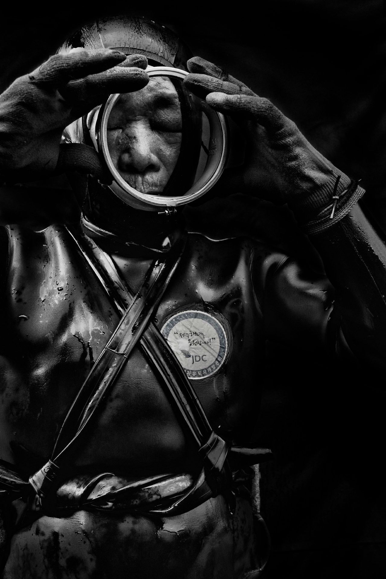 Soon Hwa Kim今年71岁,来自延寿洞。她已经当了60年海女,一生捕获了无数的岩鱼、海参、章鱼和海胆等海洋美食。图中她正在把水倒在潜水衣里,以防止脱下来的时候把潜水服的橡胶撕裂。济州岛位于韩国西南海域,以其特有的玄武岩火山岩而闻名。这里就是海女的家乡,她们被誉为韩国的“国宝”,并被联合国教科文组织列入非物质文化遗产名录。在济州岛的黑色沙滩边,海女们身着橡胶潜水套装,头戴老式的护目镜,潜入大海,捕捞海底珍馐。