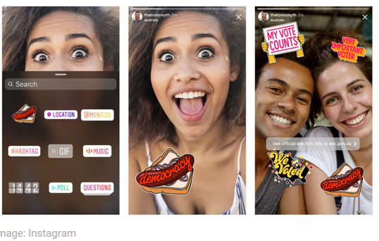今年,图片社交平台Instagram还推出了“民主热狗”的小贴纸,让年轻选民分享自己在投票当天的动态或自拍。更贴心的是,点击这些贴纸还会看到澳大利亚选举委员会提供的详细信息。