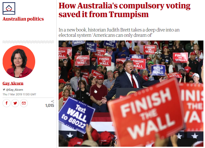 支持者则认为,当有较高比例的公民参与投票时,其选举产生的政府所作的决定更具合法性。对于这个移民国家来说,强制投票是帮助这些群体迅速融入社会大家庭的一种手段。《卫报》专栏作家奥尔康(Gay Alcorn)在今年3月撰文称,澳大利亚的强制性投票制度使这个8年里换了6个总理的国家避免了“特朗普式悲剧”。因为事实上,特朗普在2016年当选时只赢得了美国所有选民25%的选票。而在当年英国脱欧公投的案例中,真正投票支持脱欧的也只占所有选民的37%。