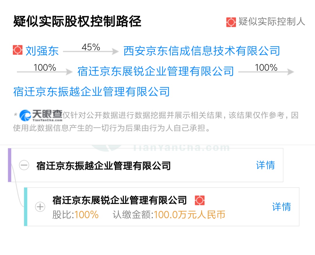 另据天眼查数据显示,宿迁京东振越企业管理有限公司成立于2018年7月,由西安京东信成信息技术有限公司全资持股,公司法定代表人张雱,现为刘强东助理。