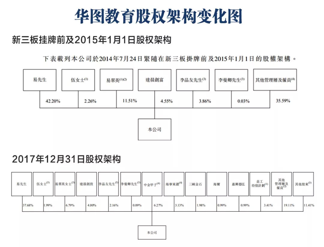 华图教育在新三板的这几年,共定增两次。2015年10月,公司拟以发行价24.39元/股,定向增发738万股人民币普通股,募集资金约1.8亿元,此次增发后,公司估值31.8亿元。时隔9个月后,公司再次定向增发972万股人民币普通股,募集资金约7亿元,但值得注意的是,此次定向增发的发行价为72元/股,相较于9个月前的定增,每股价格翻了将近3倍,公司估值高达百亿。但同时,2次大规模定增后,公司股权架构也产生重大变化。