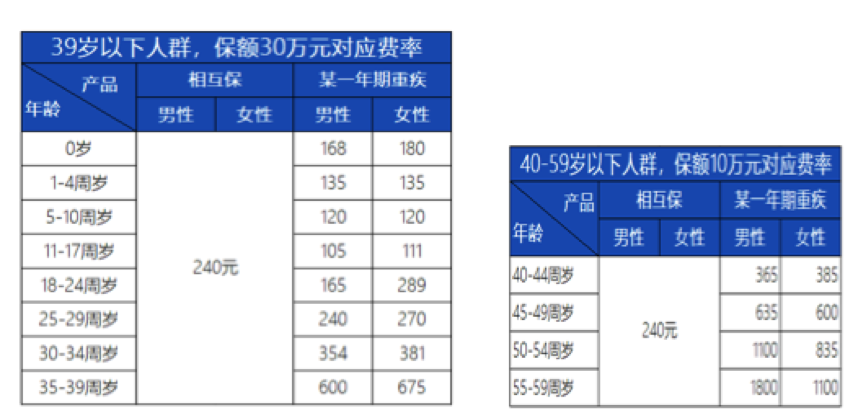 在相互保刚落地的时候,王兆曾经用重大疾病发生率、性别、社团人数等做过一个关于产品保费的测算,推演出的保费大概是每年240元,对比重疾产品费率如下图所示: