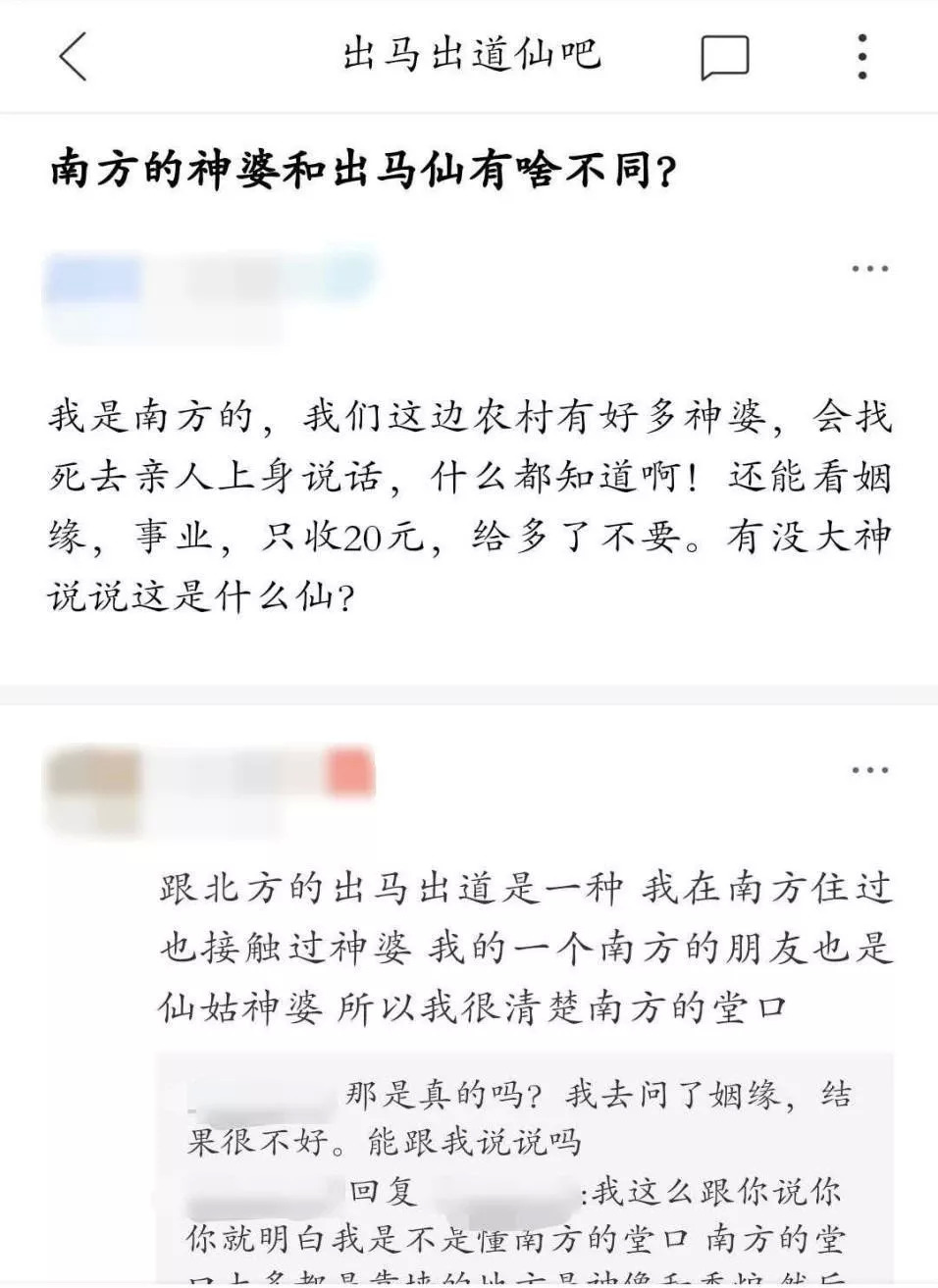 在南方农村,人们遇事会找村里的仙姑神婆,她们会请死去的亲人上身说话,通晓过去未来。这和东北的出马仙儿很接近,只不过请来的本体不同。
