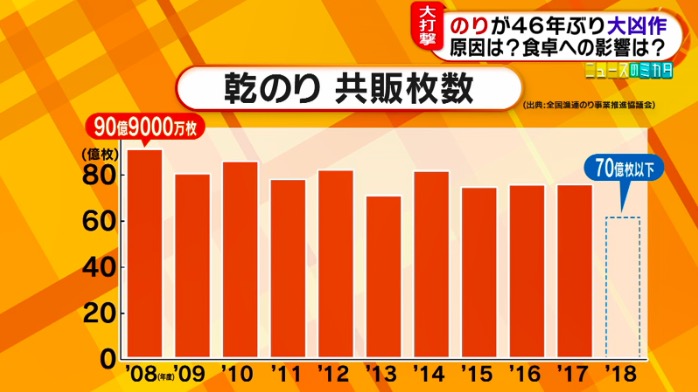 根据日本富士新闻网报道,2008财年海苔的产量约为90.9亿枚,而到了2018财年产量预计已经降至70亿枚以下,达到46年以来最低点,且其中有20%都属于营养不良型。另据央视财经报道,该国海苔产量已连续十年呈现下滑趋势,当前产量较去年同期相比减少15%。