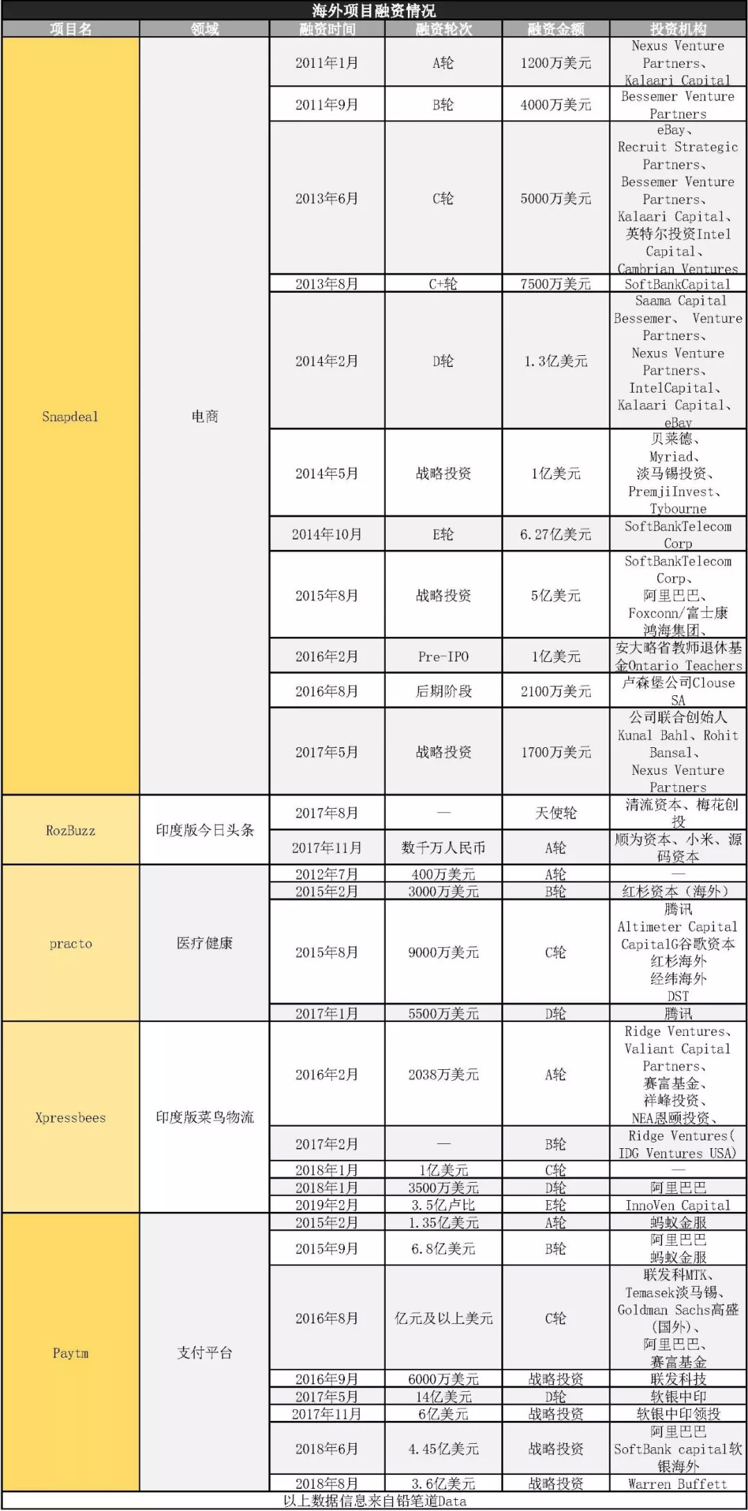 据铅笔道统计的印度5家头部企业中,如Snapdeal一家就在2011—2017年间,完成11次融资,最高一笔融资更是高达6.27亿美元,最低一轮融资也达到1200万美元。投资方更是囊括了eBay、英特尔投资、阿里巴巴、软银和富士康等。