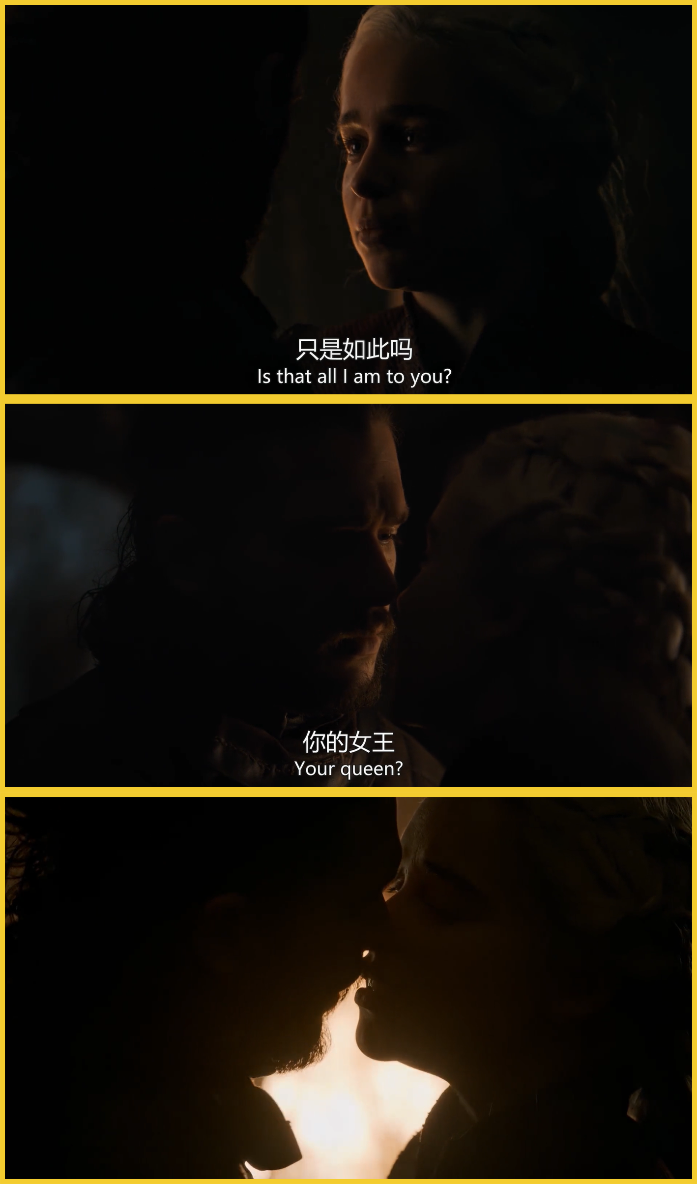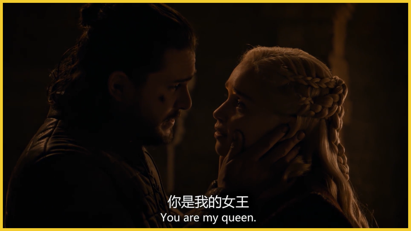 琼恩·雪诺前几季积累的好感这几集差不多全给败光了。本季他化身复读机,台词就两句“She's my queen”,“You're my queen”,妥妥一个恋爱脑。