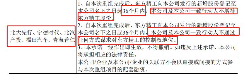 此外,北大先行、宁德时代、福田汽车等5名普莱德原股东还承诺,并购完成后不增持东方精工股份、不通过任何方式谋求对东方精工的控制权地位。东方精工实控人唐氏兄弟亦承诺,在交易完成后的60个月内不放弃东方精工的实际控制权。